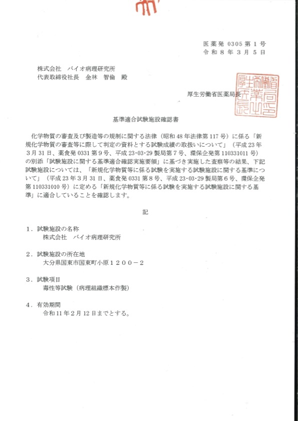 医薬品・医療機器・再生医療GLP適合確認をいただきました。