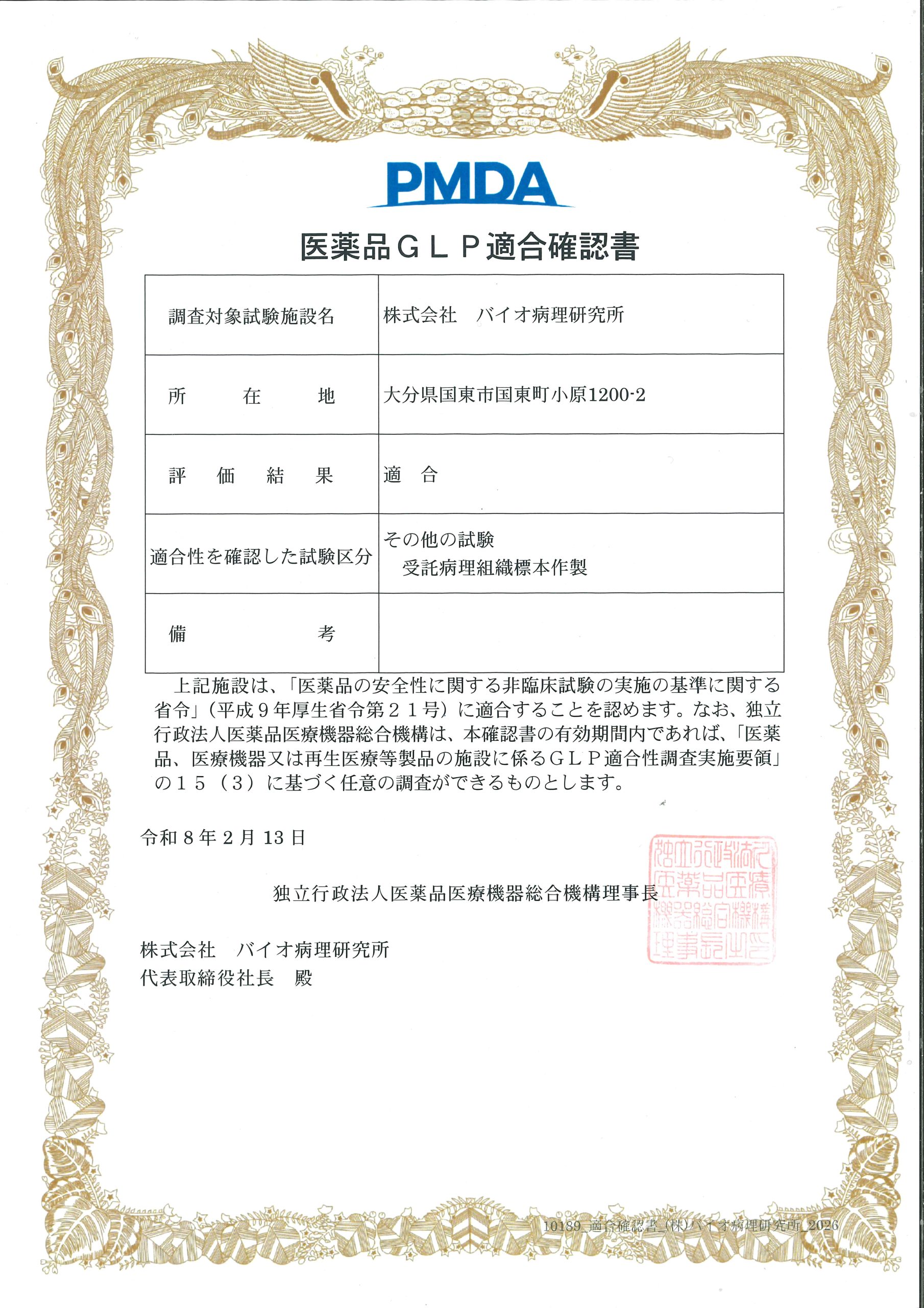 医薬品・医療機器・再生医療GLP適合確認をいただきました。