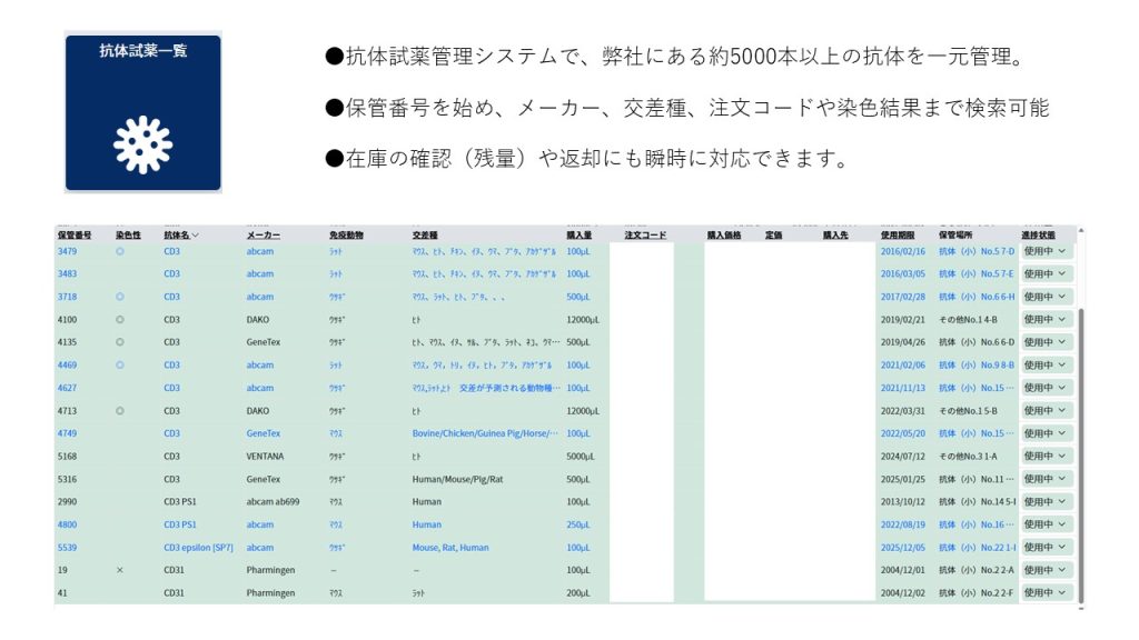 弊社では、免疫組織化学染色(IHC法)で使用する抗体を5000本以上保管しています。そのため抗体管理システムで、日々管理しています。保管番号はもとより、メーカー、交差種、注文コード、さらには染色結果やバーチャルシステムと連動して染色画像も管理および検索することが可能です。
