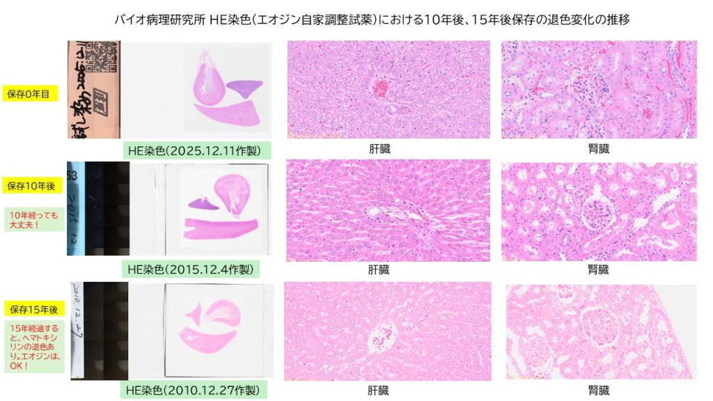 HE染色の構成:ヘマトキシリンは市販の試薬を使用、エオジンは、弊社自家調整試薬で染色されていますが、退色変化は作製後約10年~15年までは維持できることが確認できました。作製15年後は、ヘマトキシリンの退色が確かに認められていますが、エオジンに関しては診断可能な色合いを維持できています。また、スライドカバーガラス内に気泡などの混入は一切ありませんでした。